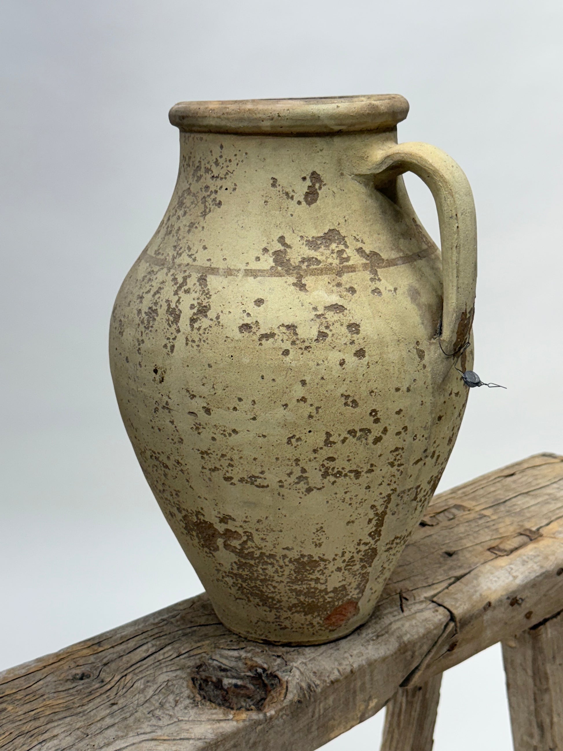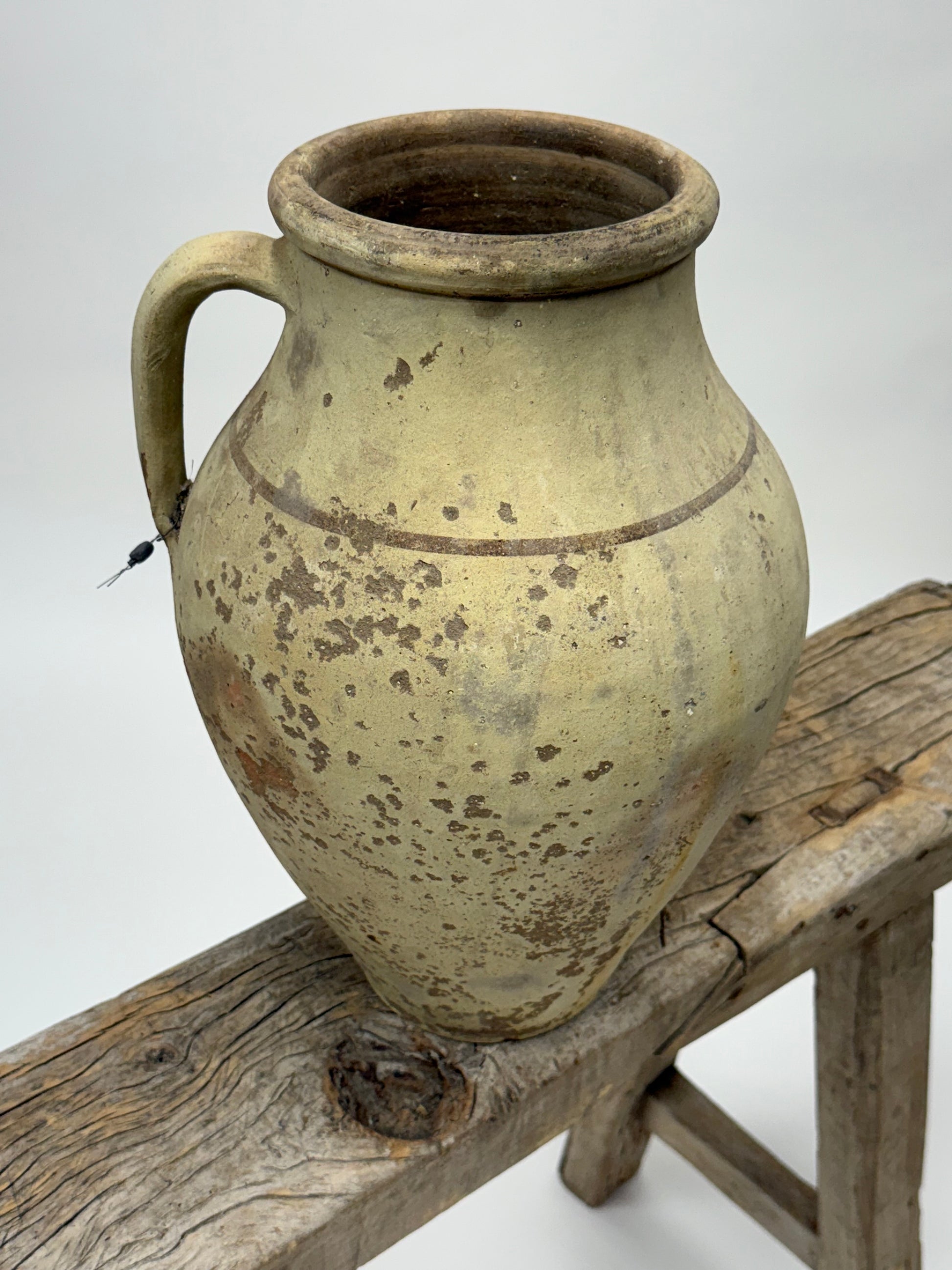 This vintage Turkish vase stands 14 inches tall with a 4.5-inch-wide opening, featuring a stunning patina and textural depth that reveal its handcrafted history. The naturally aged surface exudes rustic elegance, making it a timeless accent for any interior. Style it on its own or with dried botanicals to highlight its sculptural form and organic charm.