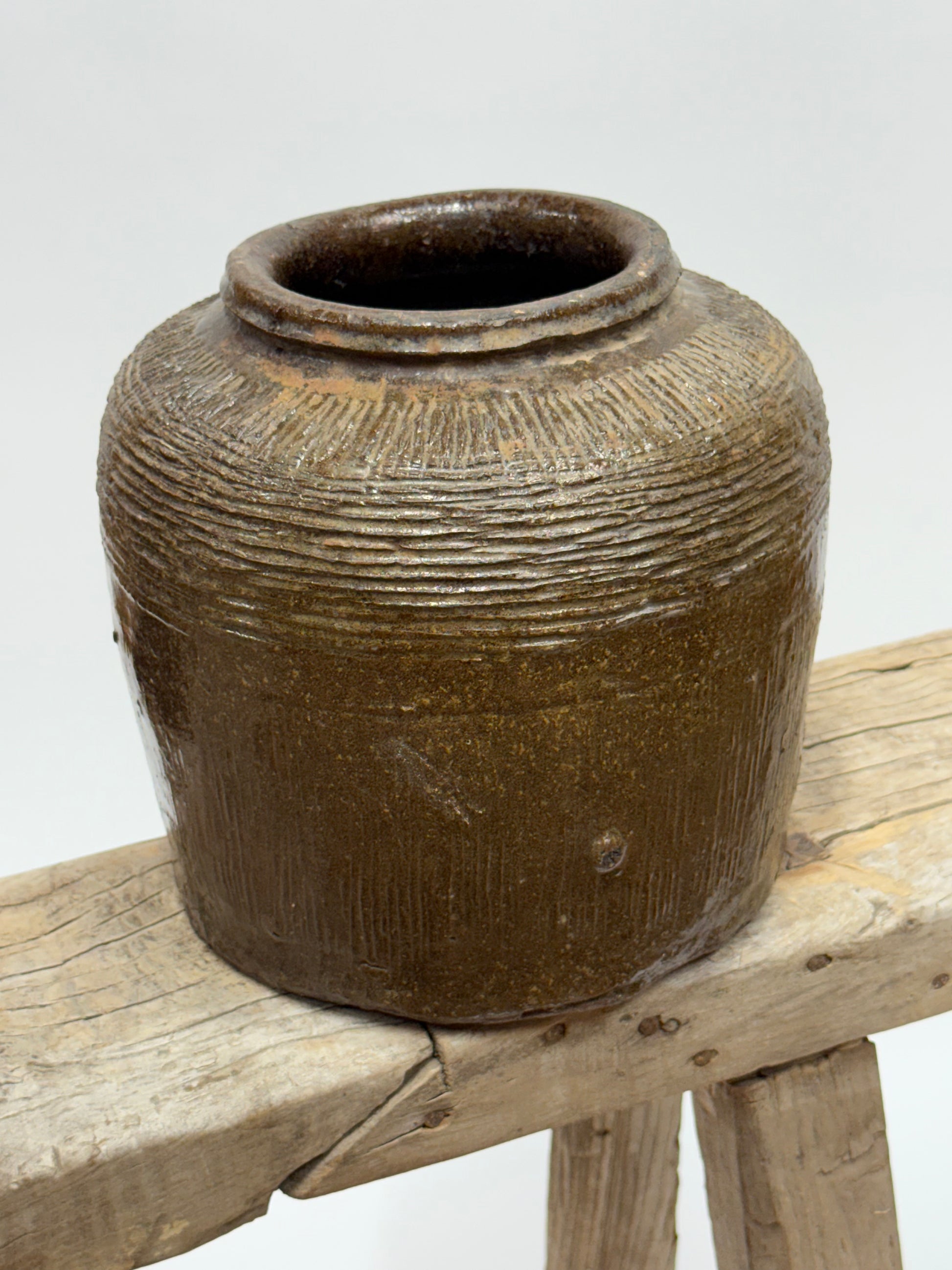 This vintage Chinese bean pot features a rich warm green/brown glaze and weathered finish. Measuring 8” tall and 8” wide with a 4.5” opening, it adds rustic charm and character to any space.