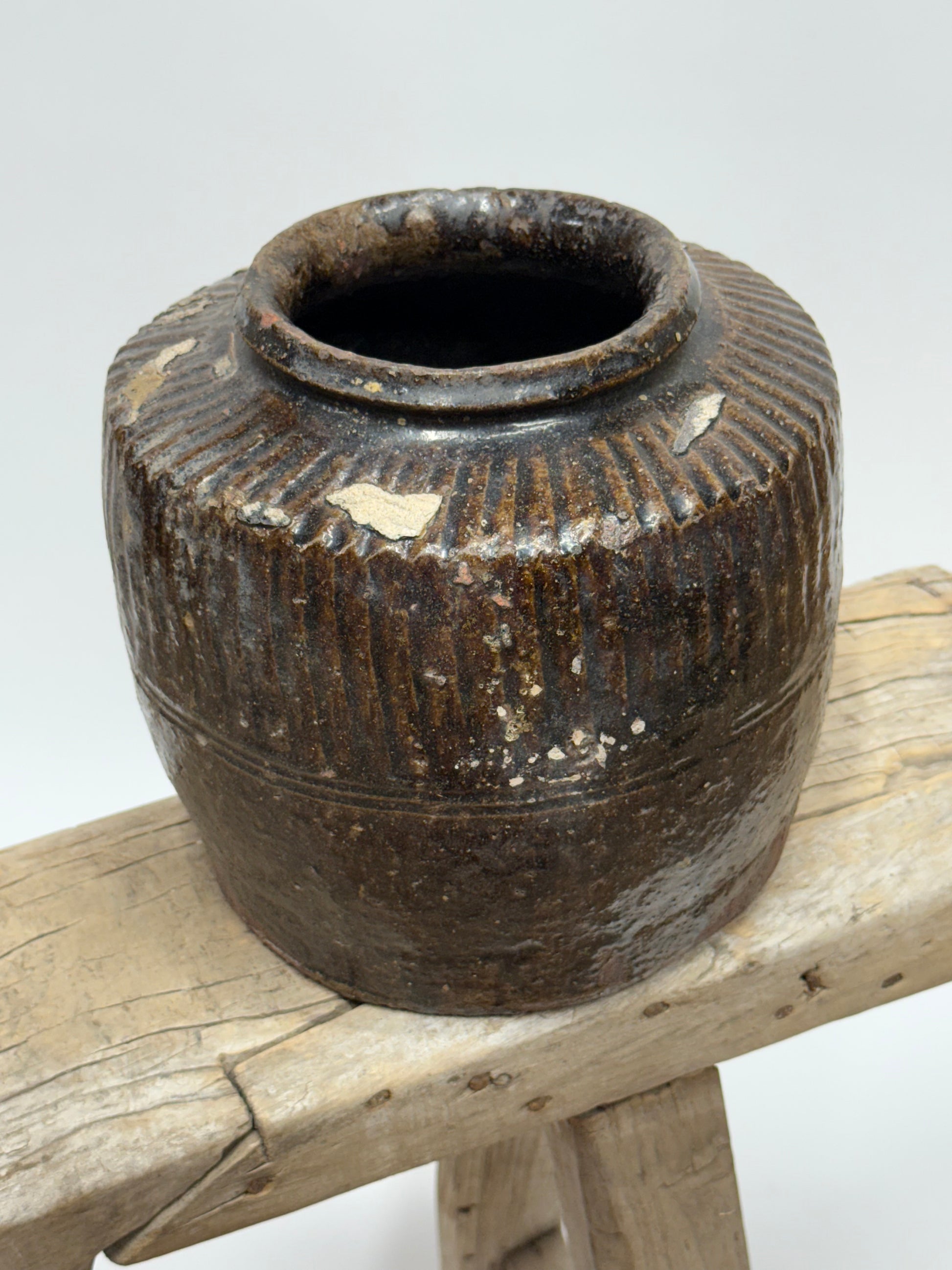 This vintage Chinese bean pot features a rich warm brown glaze and weathered finish. Measuring 9” tall and 9” wide with a 4.5” opening, it adds rustic charm and character to any space.