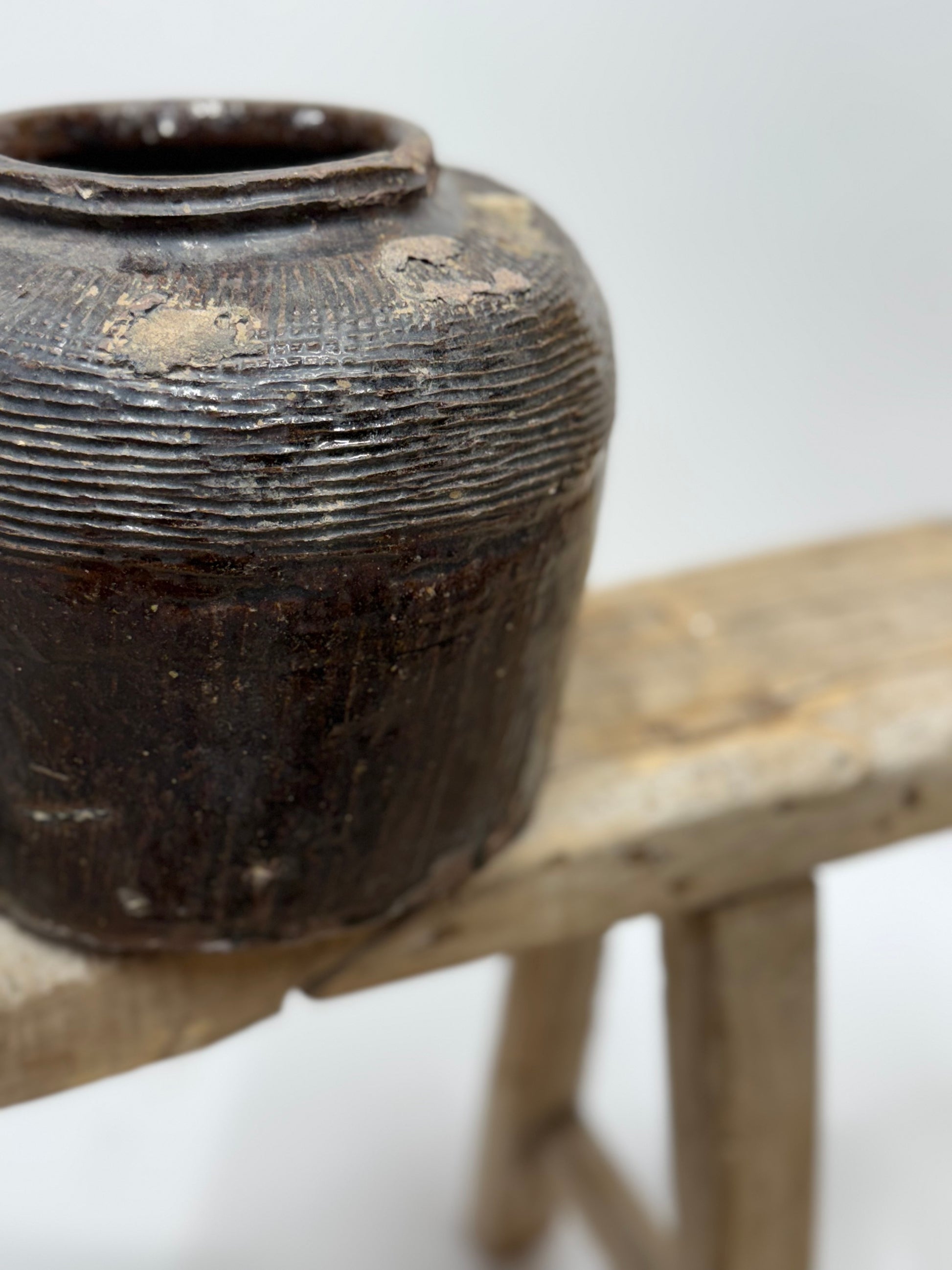 This vintage Chinese bean pot features a rich warm brown glaze and weathered finish. Measuring 9” tall and 9” wide with a 4.5” opening, it adds rustic charm and character to any space.