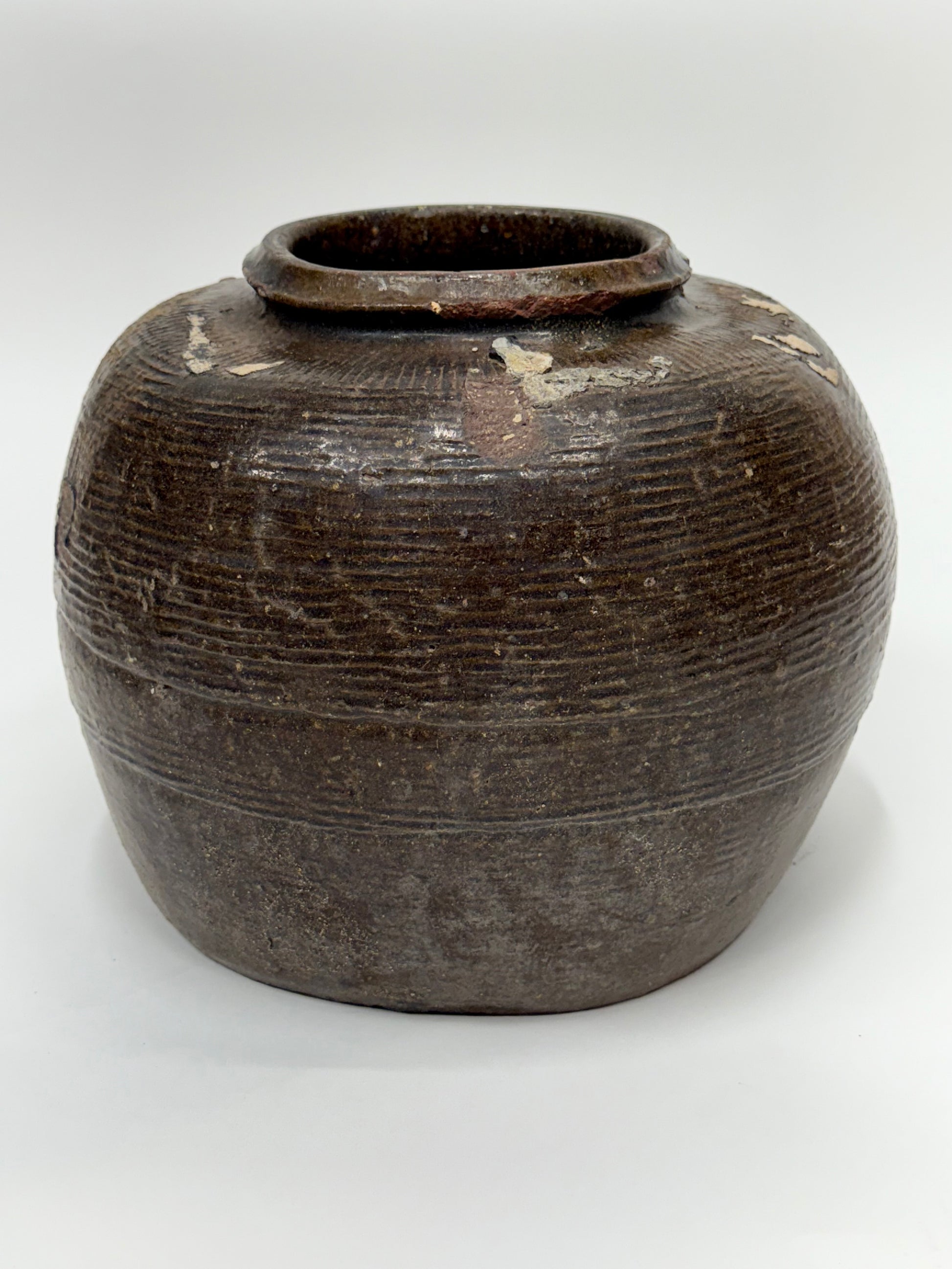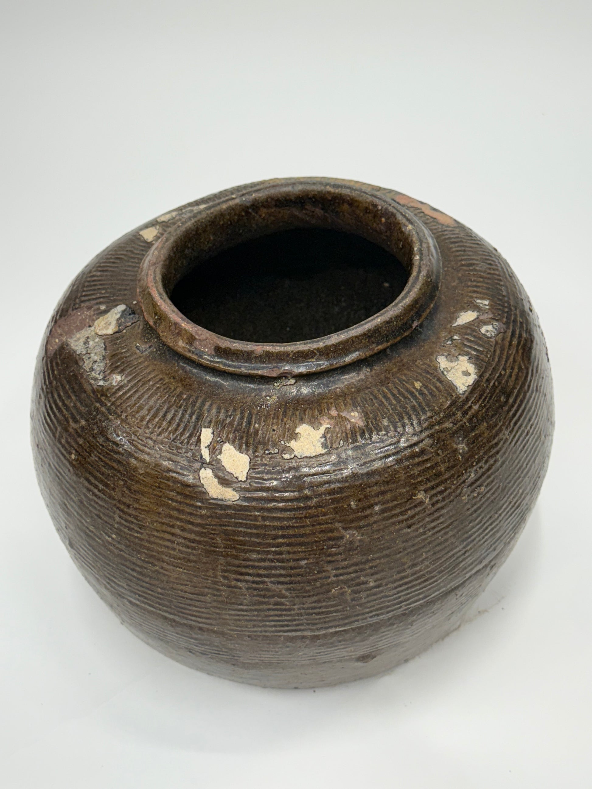 This vintage Chinese bean pot features a rich warm brown glaze and weathered finish. Measuring 10 inches tall and 10 inches wide with a 5” opening, it adds rustic charm and character to any space.